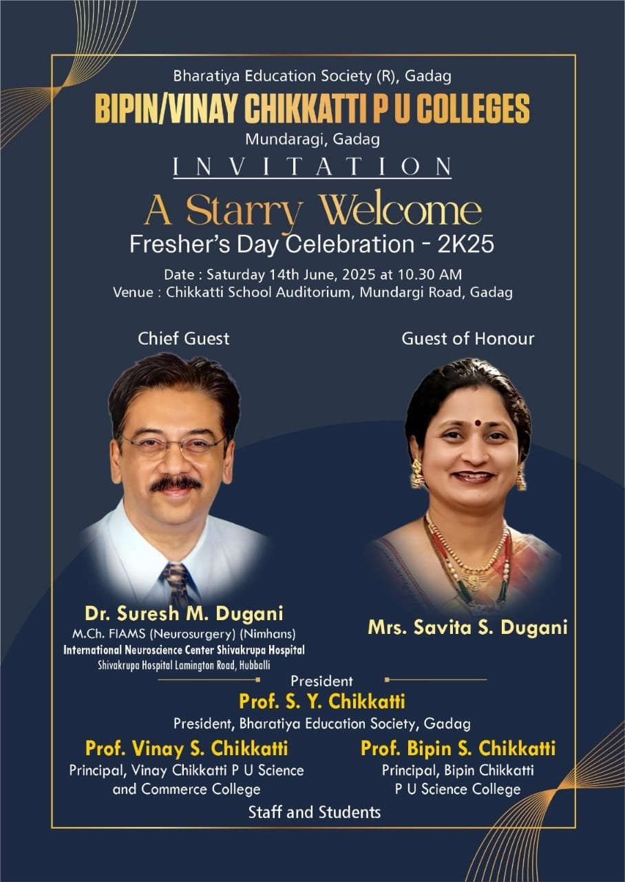 ಗದಗ, ಜೂನ್ 12: ಭಾರತೀಯ ಶಿಕ್ಷಣ ಸೊಸೈಟಿಯ ಗದುಗಿನ ಚಿಕ್ಕಟ್ಟಿ ಸಮೂಹ ಶಿಕ್ಷಣ ಸಂಸ್ಥೆಯ, ಬಿಪಿನ್ ಮತ್ತು ವಿನಯ್ ಚಿಕ್ಕಟ್ಟಿ ಪಿಯು ಕಾಲೇಜುಗಳು, ಗದಗ ಸಂಯುಕ್ತ ಆಶ್ರಯದಲ್ಲಿ “ನಕ್ಷತ್ರಗಳ ಸ್ವಾಗತ” ಎಂಬ ಷೀರ್ಷಿಕೆಯಡಿ ಫ್ರೆಶರ್ಸ್ ಡೇ – 2K25 ಕಾರ್ಯಕ್ರಮವನ್ನು ಇದೇ ಶನಿವಾರ, ಜೂನ್ 14ರಂದು ವಿಜೃಂಭಣೆಯಿಂದ ಆಚರಿಸಲಾಗುತ್ತಿದೆ.