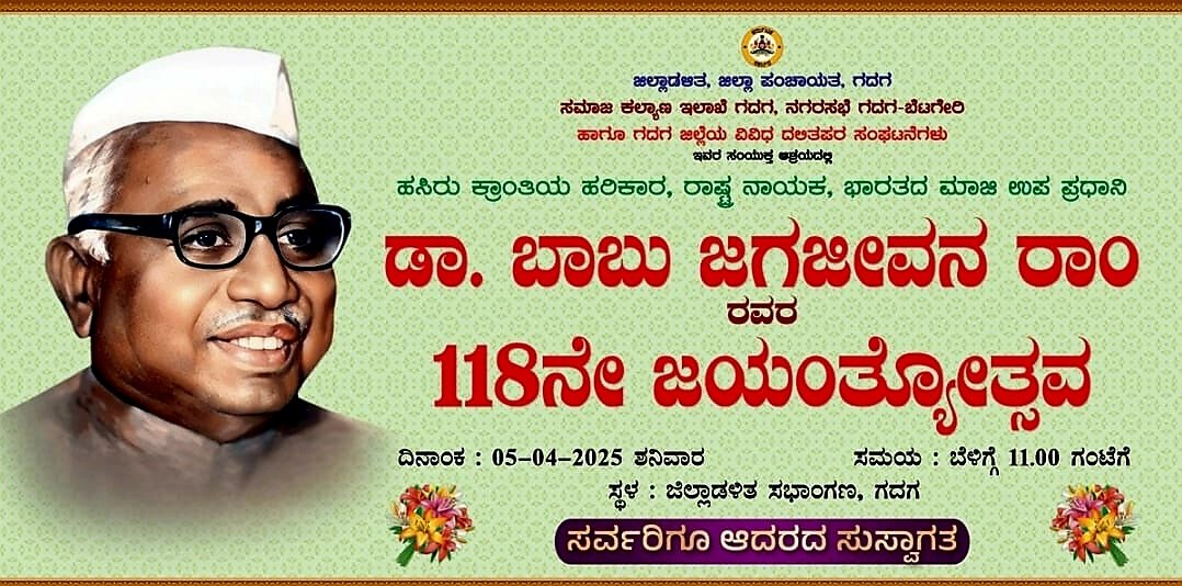 ಈ ಹಿನ್ನೆಲೆಯಲ್ಲಿ, ಶನಿವಾರ, ಏಪ್ರಿಲ್ 5, 2025 ರಂದು ಬೆಳಿಗ್ಗೆ 11 ಗಂಟೆಗೆ ಗದಗ ಜಿಲ್ಲಾ ಆಡಳಿತದ ಸಭಾಂಗಣದಲ್ಲಿ ಪೂಜಾ ಕಾರ್ಯಕ್ರಮ ಆಯೋಜಿಸಲಾಗಿದೆ. ಜಿಲ್ಲಾಡಳಿತದ ನಿರ್ದೇಶನದಂತೆ ನಡೆಯಲಿರುವ ಈ ಕಾರ್ಯಕ್ರಮದಲ್ಲಿ ಡಾ. ಬಾಬು ಜಗಜೀವನ್ ರಾಮ್ ಅವರ ಸೇವೆ ಮತ್ತು ಕೊಡುಗೆಗಳನ್ನು ಸ್ಮರಿಸಲಾಗುವುದು.