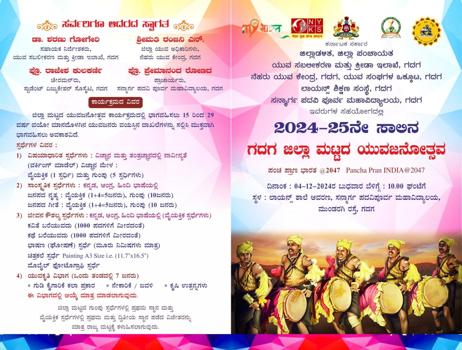 ಗದಗ : ಕರ್ನಾಟಕ ಸರ್ಕಾರ, ಜಿಲ್ಲಾಡಳಿತ, ಜಿಲ್ಲಾ ಪಂಚಾಯತ್, ಯುವ ಸಬಲೀಕರಣ ಮತ್ತು ಕ್ರೀಡಾ ಇಲಾಖೆ, ಗದಗ, ನೆಹರು ಯುವ ಕೇಂದ್ರ, ಗದಗ ಯುವ ಸಂಘಗಳ ಒಕ್ಕೂಟ, ಗದಗ, ಲಾಯನ್ಸ್ ಶಿಕ್ಷಣ ಸಂಸ್ಥೆ, ಸನ್ಮಾರ್ಗ ಪದವಿ ಪೂರ್ವ ಮಹಾವಿದ್ಯಾಲಯಗಳ ಸಂಯುಕ್ತ ಆಶ್ರಯದಲ್ಲಿ ೨೦೨೪-೨೫ ನೇ ಸಾಲಿನ ಜಿಲ್ಲಾ ಮಟ್ಟದ ಯುವ ಜನೋತ್ಸವವನ್ನು ದಿ : ೦೪/೧೨/೨೦೨೪ ರ ಬುಧವಾರ ಬೆಳಿಗ್ಗೆ ೧೦.೦೦ ಗಂಟೆಗೆ ಲಾಯನ್ಸ್ ಶಾಲೆ ಆವರಣ, ಸನ್ಮಾರ್ಗ ಪದವಿ ಪೂರ್ವ ಮಹಾವಿದ್ಯಾಲಯ, ಮುಂಡರಗಿ ರಸ್ತೆ, ಗದಗದಲ್ಲಿ ಜರುಗಿಸಲು ನಿರ್ಧರಿಸಲಾಗಿದೆ.