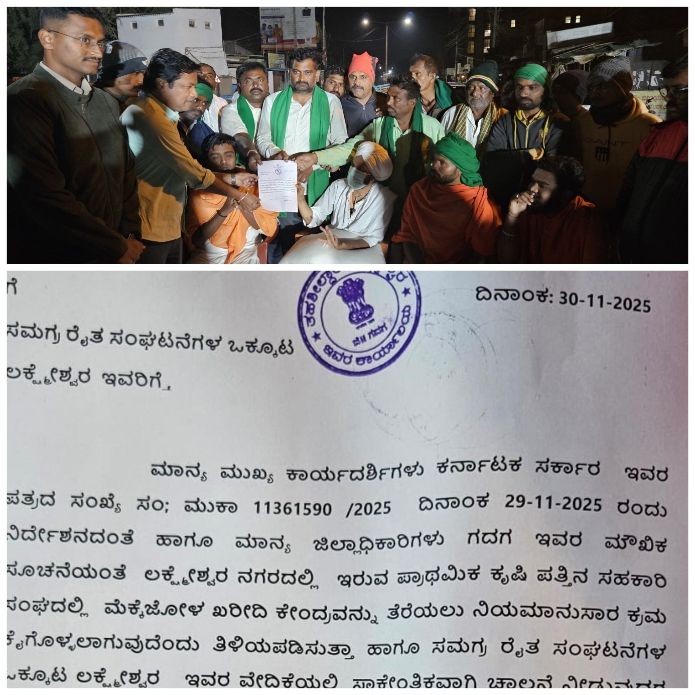 ತಡರಾತ್ರಿ ಕರ್ನಾಟಕ ಸರಕಾರದ ಮುಖ್ಯ ಕಾರ್ಯದರ್ಶಿ ಆದೇಶದ ಪ್ರಕಾರ ಶಾಲಿನಿ ರಜನೀಶ್ ಅವರು ಸೋಮವಾರದಿಂದ ಖರೀದಿ ಕೇಂದ್ರ ಆರಂಭಿಸುವಂತೆ ನೀಡಿದ ಆದೇಶ ಪತ್ರವನ್ನು ಲಕ್ಷ್ಮೇಶ್ವರ ತಹಶೀಲ್ದಾರ್ ಧನಂಜಯ ಮುಖಾಂತರ ತಲುಪಿಸಿದರು. ಆದರೆ ಆದೇಶ ಪತ್ರದಲ್ಲಿ ಲಕ್ಷ್ಮೇಶ್ವರ ತಾಲೂಕಿನಲ್ಲಿ ಖರೀದಿ ಕೇಂದ್ರಗಳ ಹೆಸರು ನಮೂದಿಸದಿರುವದನ್ನು ಗಮನಿಸಿದ ಪೂಜ್ಯರು ಹಾಗೂ ಪ್ರತಿಭಟನಾನಿರತರು ಅಧಿಕಾರಿಗಳನ್ನು ತೀವ್ರ ತರಾಟೆಗೆ ತೆಗೆದುಕೊಂಡು ರಾತ್ರಿಯೆ ಶಿಗ್ಲಿ ನಾಕಾದಲ್ಲಿ ಪಾಳಾ-ಬದಾಮಿ ರಸ್ತೆ ಬಂದ್ ಮಾಡಿ ರಸ್ತೆಯಲ್ಲಿಯೇ ಪ್ರತಿಭಟನಾ ನಿರತರು ಭಜನೆ ಮಾಡಲು ಮುಂದಾದರು.
