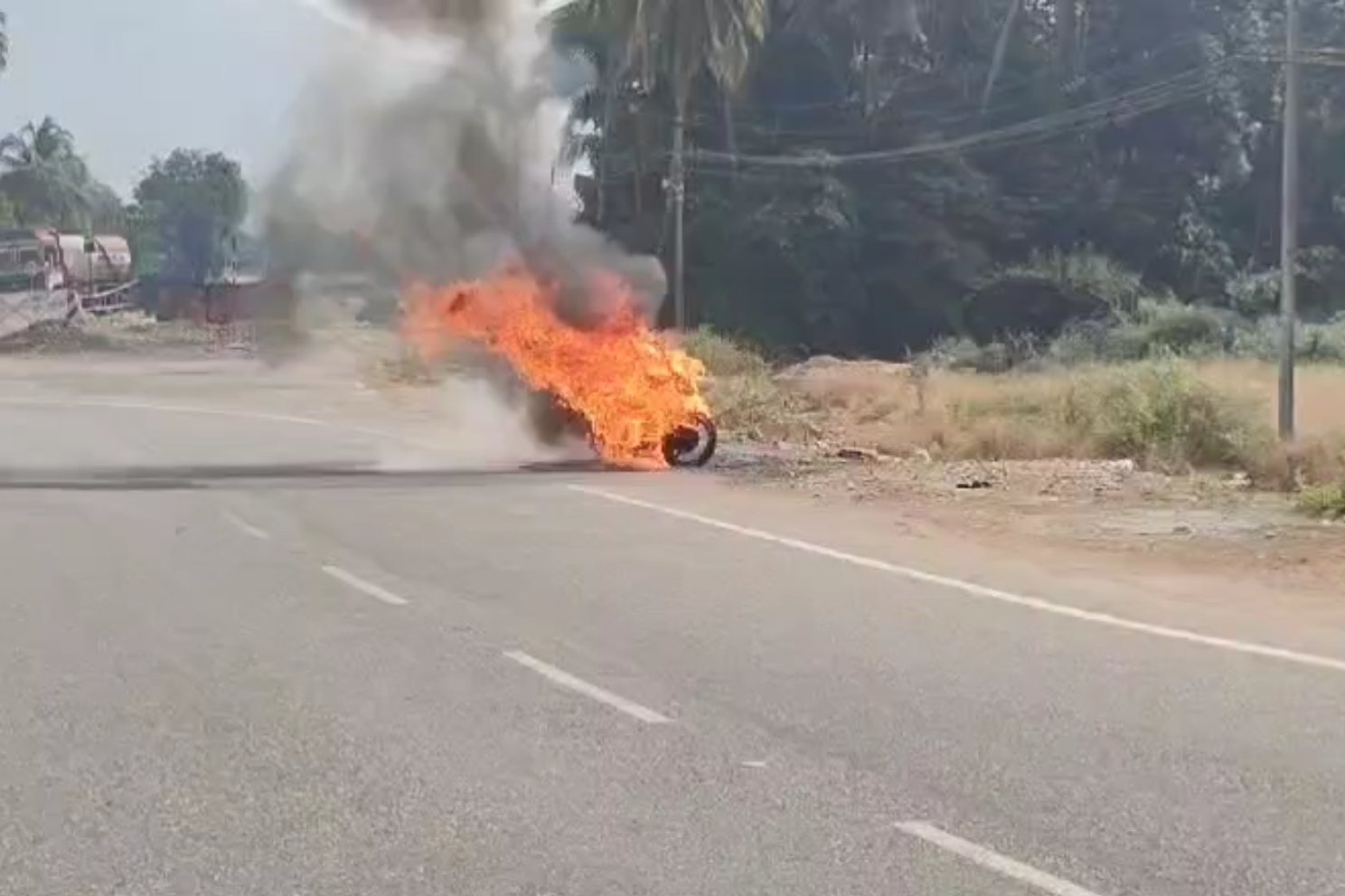 ಬೈಕ್ ಸವಾರ ಉತ್ತರ ಪ್ರದೇಶ ಮೂಲದವನಾಗಿದ್ದು, ಹೊಗೆ ಕಾಣಿಸಿದ ತಕ್ಷಣ ಎಚ್ಚೆತ್ತುಕೊಂಡು, ಬೈಕ್ ಗೆ ಇದ್ದ ಲಗೇಜು ಹೊತ್ತೋಯ್ದು ಪ್ರಾಣ ಉಳಿಸಿಕೊಂಡಿದ್ದಾನೆ. ಅರೆ ಕ್ಷಣದಲ್ಲಿ ಬೈಕ್ ಸಂಪೂರ್ಣ ಹೊತ್ತಿ ಉರಿದು ಸುಟ್ಟು ಕರಕಲಾಗಿದೆ.