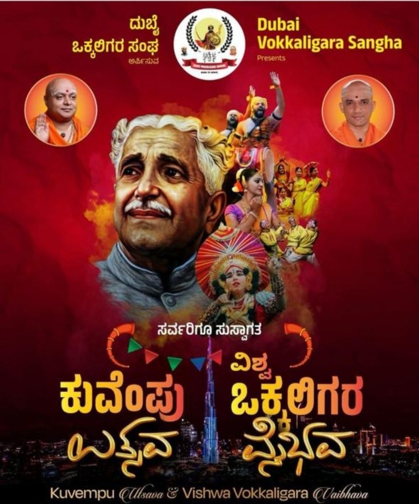 ದುಬೈ ಒಕ್ಕಲಿಗರ ಸಂಘದ ಆಶ್ರಯದಲ್ಲಿ ಎಪ್ರಿಲ್ 20 ರಂದು ವಿಶೇಷ ಸಾಂಸ್ಕೃತಿಕ ಸಮಾರಂಭ – ಕುವೆಂಪು ಉತ್ಸವ ಹಾಗೂ ವಿಶ್ವ ಒಕ್ಕಲಿಗರ ವೈಭವ – ಅದ್ದೂರಿಯಾಗಿ ನಡೆಯಲಿದೆ. ಈ ಐತಿಹಾಸಿಕ ಕಾರ್ಯಕ್ರಮವು ಕನ್ನಡ ಸಾಹಿತ್ಯದ ಮಹಾನ್ ಕವಿ, “ರಾಷ್ಟ್ರಕವಿ” ಕುವೆಂಪು ಅವರ ಪರಂಪರೆ ಹಾಗೂ ವಿಶ್ವದಾದ್ಯಂತ ಹರಡುವ ಒಕ್ಕಲಿಗರ ಸಮುದಾಯದ ವೈಭವವನ್ನು ವಿಭಿನ್ನ ಶೈಲಿಯಲ್ಲಿ ಸಂಯೋಜಿಸುವ ವಿಶಿಷ್ಟ ಪ್ರಯತ್ನವಾಗಿದೆ.