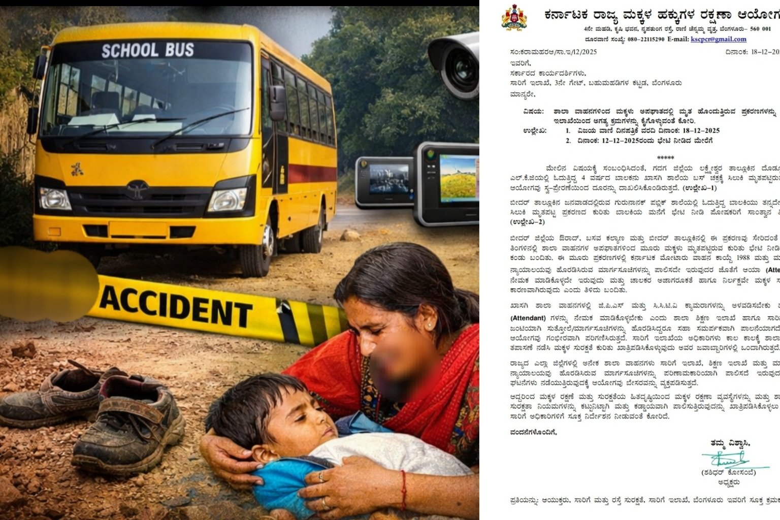 ಇದೇ ವೇಳೆ, ಮಕ್ಕಳ ರಕ್ಷಣೆ ಹಾಗೂ ಸುರಕ್ಷತೆಯ ಹಿತದೃಷ್ಟಿಯಿಂದ ಶಾಲಾ ವಾಹನಗಳಲ್ಲಿ ಮಕ್ಕಳ ರಕ್ಷಣಾ ವ್ಯವಸ್ಥೆಗಳು ಹಾಗೂ ಸುರಕ್ಷತಾ ನಿಯಮಗಳನ್ನು ಕಟ್ಟುನಿಟ್ಟಾಗಿ ಮತ್ತು ಕಡ್ಡಾಯವಾಗಿ ಜಾರಿಗೆ ತರುವಂತೆ ಸರ್ಕಾರದ ಕಾರ್ಯದರ್ಶಿಗಳಿಗೆ ಕರ್ನಾಟಕ ರಾಜ್ಯ ಮಕ್ಕಳ ಹಕ್ಕುಗಳ ರಕ್ಷಣಾ ಆಯೋಗದ ಅಧ್ಯಕ್ಷರಾದ ಶಶೀಧರ ಕೋಸಂಬೆ ಅವರು ಪತ್ರ ಬರೆದಿದ್ದಾರೆ.
