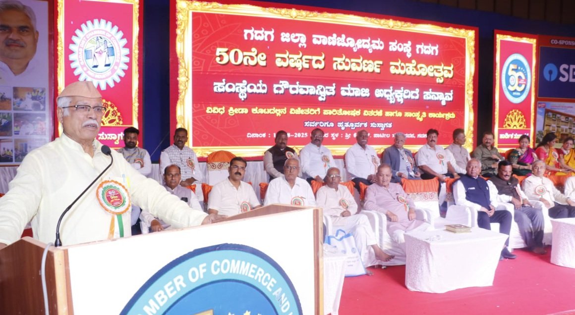 ನಗರದ ಕೆ.ಎಚ್.ಪಾಟೀಲ್ ಸಭಾಭವನದಲ್ಲಿ ಶನಿವಾರ ಸಂಜೆ ಗದಗ ಜಿಲ್ಲಾ ವಾಣಿಜ್ಯೋದ್ಯಮ ಸಂಸ್ಥೆಯ 50 ನೇ ವರ್ಷದ ಸುವರ್ಣ ಮಹೋತ್ಸವ ಅಂಗವಾಗಿ ಆಯೋಜಿಸಿದ್ದ ಪಾರಿತೋಷಕ ವಿತರಣಾ ಹಾಗೂ ಸಾಂಸ್ಕೃತಿಕ ಕಾರ್ಯಕ್ರಮದಲ್ಲಿ ಅವರು ಮುಖ್ಯ ಅತಿಥಿಗಳಾಗಿ ಮಾತನಾಡಿದರು.