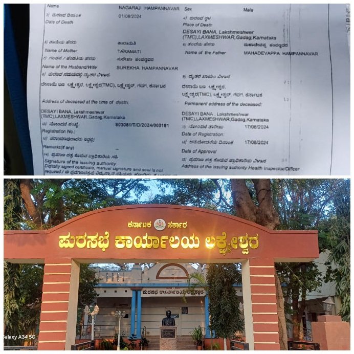 ಗದಗ ಜಿಲ್ಲೆಯ ಲಕ್ಷ್ಮೇಶ್ವರ ಪಟ್ಟಣದ ದೇಸಾಯಿ ಬಾಣ ವ್ಯಾಪ್ತಿಯ ಅಶೋಕ ಮಹಾದೇವಪ್ಪ ಹಂಪಣ್ಣವರ ಎಂಬುವವರು ಅನಾರೋಗ್ಯದಿಂದ ದಿನಾಂಕ ಅಗಸ್ಟ್ ೧, ೨೦೨೪ ರಂದು ಮೃತಪಟ್ಟಿದ್ದರು. ತಮ್ಮ ಸಹೋದರ ಅಶೋಕ ಅವರು ಮರಣ ಹೊಂದಿದ್ದು ಆತನ‌ ಮರಣ ಪ್ರಮಾಣ ಪತ್ರ ನೀಡುವಂತೆ ಸಹೋದರ ನಾಗರಾಜ ಮಹಾದೇವಪ್ಪ ಹಂಪಣ್ಣವರ ಅಗಸ್ಟ ೯, ೨೦೨೪ ರಂದು ಪಟ್ಟಣದ ಪುರಸಭೆಯ ಜನನ ಮತ್ತು ಮರಣ ಅಧಿಕಾರಿಗಳಿಗೆ ನೋಂದಣಿಗಾಗಿ ಅರ್ಜಿ ಸಲ್ಲಿಸಿದ್ದರು.