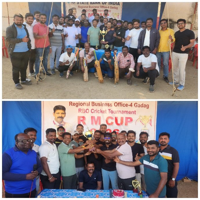 ಗದಗ: ಸ್ಟೇಟ್ ಬ್ಯಾಂಕ್ ಆಫ್ ಇಂಡಿಯಾ ರಿಜಿನಲ್ ಬಿಜಿನೆಸ್ ಆಫೀಸ್ – 4 ಆರ್ ಬಿ ಓ , ಇವರ ಆಶ್ರಯದಲ್ಲಿ ಬ್ಯಾಂಕ್ ಉದ್ಯೋಗಿಗಳಿಗಾಗಿ ಆಯೋಜಿಸಲಾಗಿದ್ದ ಒಂದು ದಿನಗಳ ಆರ್ ಎಂ ಕಪ್ ಕ್ರಿಕೆಟ್ ಪಂದ್ಯಾವಳಿ ಲಕ್ಷ್ಮೇಶ್ವರದ ಉಮಾ ಮಹಾ ವಿದ್ಯಾಲಯ ಮೈದಾನದಲ್ಲಿ ಯಶಸ್ವಿಯಾಗಿ ನಡೆಯಿತು.