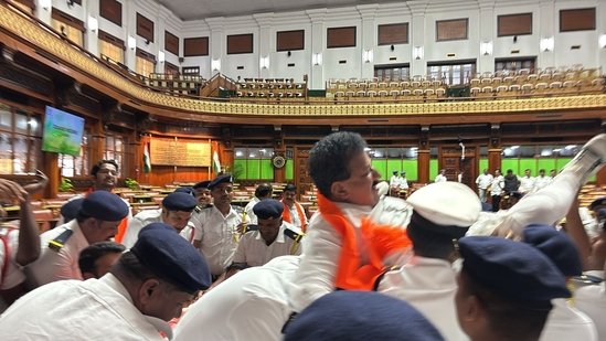 ನಂತರ ಮುಸ್ಲಿಂ ಮೀಸಲಾತಿ ವಿಧೇಯಕದ ಕುರಿತು ಸರ್ಕಾರ ಚರ್ಚೆಗೆ ಮುಂದಾಯಿತು. ಇದೇ ವೇಳೆ ಬಿಜೆಪಿ ಶಾಸಕರು ತೀವ್ರ ವಿರೋಧ ವ್ಯಕ್ತಪಡಿಸಿದರು. ಅಲ್ಲದೆ, ವಿಧೇಯಕದ ಪ್ರತಿಗಳನ್ನು ಹರಿದು ಸ್ಪೀಕರ್ ಮೇಲೆ ಎಸೆಯುತ್ತಾ, ‘ಹನಿಟ್ರ್ಯಾಪ್ ಸರ್ಕಾರ’ ಎಂದು ಘೋಷಣೆಗಳನ್ನು ಕೂಗಿದರು. ಇದೇ ವೇಳೆ ಸ್ಪೀಕರ್ ಸಹ ಶಾಸಕರು ತಾಳ್ಮೆ ವಹಿಸುವಂತೆ, ಕಲಾಪಕ್ಕೆ ಅಡ್ಡಿಪಡಿಸದಂತೆ ಮನವಿ ಮಾಡಿದರು. ಆದರೂ ಸಹ ವಿಪಕ್ಷ ಬಿಜೆಪಿ ಸದಸ್ಯರು ಪ್ರತಿಭಟನೆ ಮುಂದುವರಿಸಿದರು. ಇದರಿಂದ ಸ್ಪೀಕರ್​ 18 ಬಿಜೆಪಿ ಸದಸ್ಯರನ್ನು 6 ತಿಂಗಳು ಕಲಾಪದಿಂದ ಅಮಾನತುಗೊಳಿಸಿ ರೂಲಿಂಗ್ ಹೊರಡಿಸಿದರು.