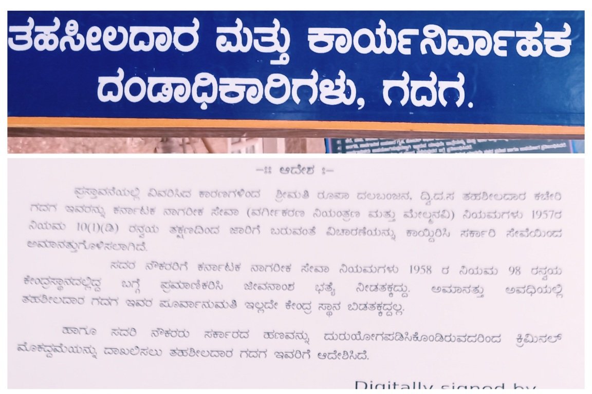 Home » News » ಸರ್ಕಾರದ ಪಹಣಿ ದುಡ್ಡು ಗುಳುಂ! ಗದಗ ಕಂದಾಯ ಇಲಾಖೆ SDA ಅಮಾನತ್ತು! ಕ್ರಿಮಿನಲ್ ಕೇಸ್ ದಾಖಲು! ಅಬ್ಬಬ್ಬಾ..! ಬೆಲಿಯೇ ಎದ್ದು ಹೊಲ ಮೇಯ್ದ ಕಥೆಯಿದು!